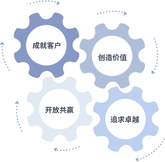 成就客户是一切决策的出发点,,,创造价值是衡量所有工作的标准,,,追求卓越是我们做事做人的态度,,,开放共赢是我们的格局也是最终的结果。。。。价值观的齿轮环环相扣,,,,推动着组织里的每个人不断向前。。。